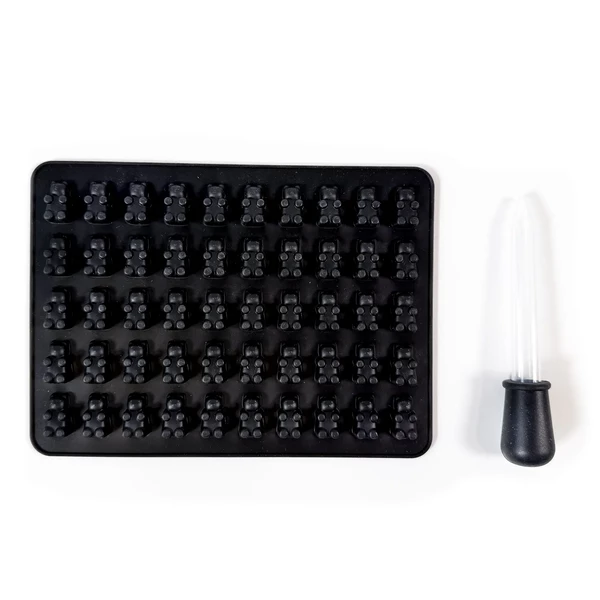Připrav si konzistentní edibles na jedno jednoduché nalití. Tahle černá silikonová forma na gumové medvídky je navržená tak, abys v jedné várce vytvořil/a 50 stejně velkých gumových medvídků, díky tomu snadněji uhlídáš velikost, tvar i dávkování. Součástí balení je i praktická pipeta/kapátko, se kterým naplníš každou dutinu čistěji, s menším nepořádkem a ztrátami.